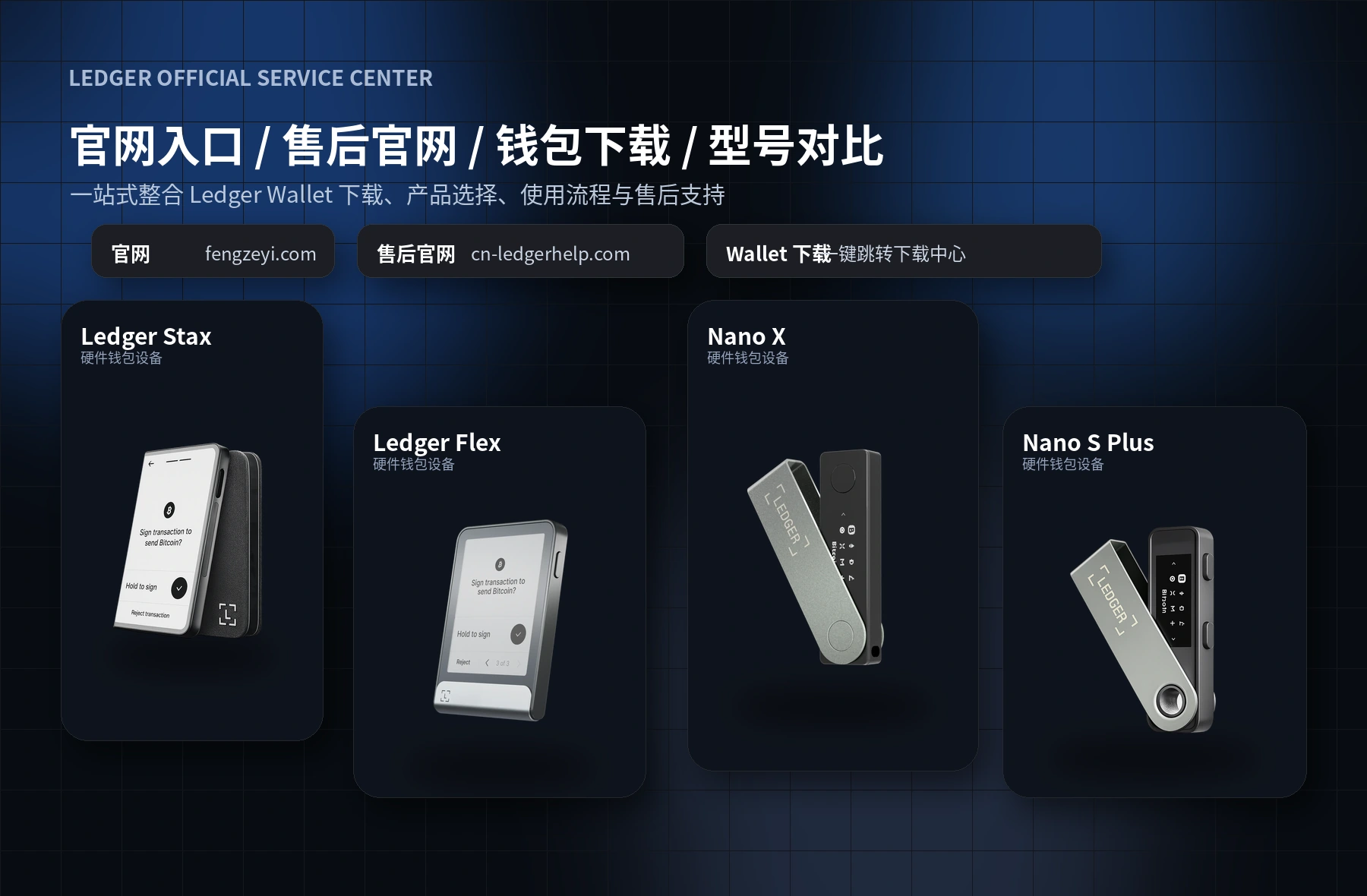 集中展示官网入口、售后官网、Ledger Wallet 下载、4 款主力产品、产品型号对比、设备使用流程、安全要点与售后支持,帮助用户更高效地完成选购、下载、连接、使用与售后处理。